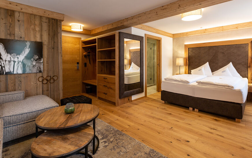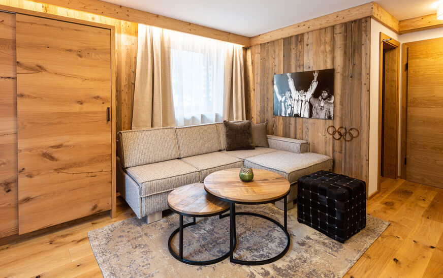 A typical Tyrolean style furnished suite with cozy living area and stunning views of the mountains 48m²